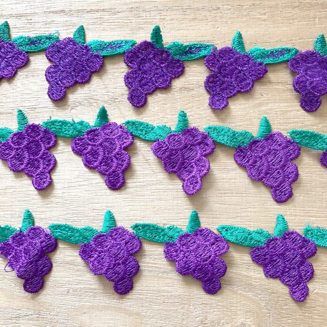 93 cm de GALON DENTELLE GUIPURE, applique grappe de raisin vert et prune ** 40 mm ** Couture, carterie, poupée - FDS040